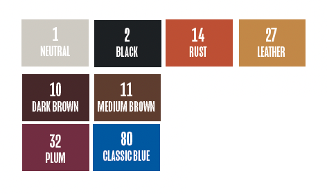 11 MEDIUM BROWN, 27 LEATHER, 31 RED, 32 PLUM, 80 CLASSIC BLUE, NEUTRAL